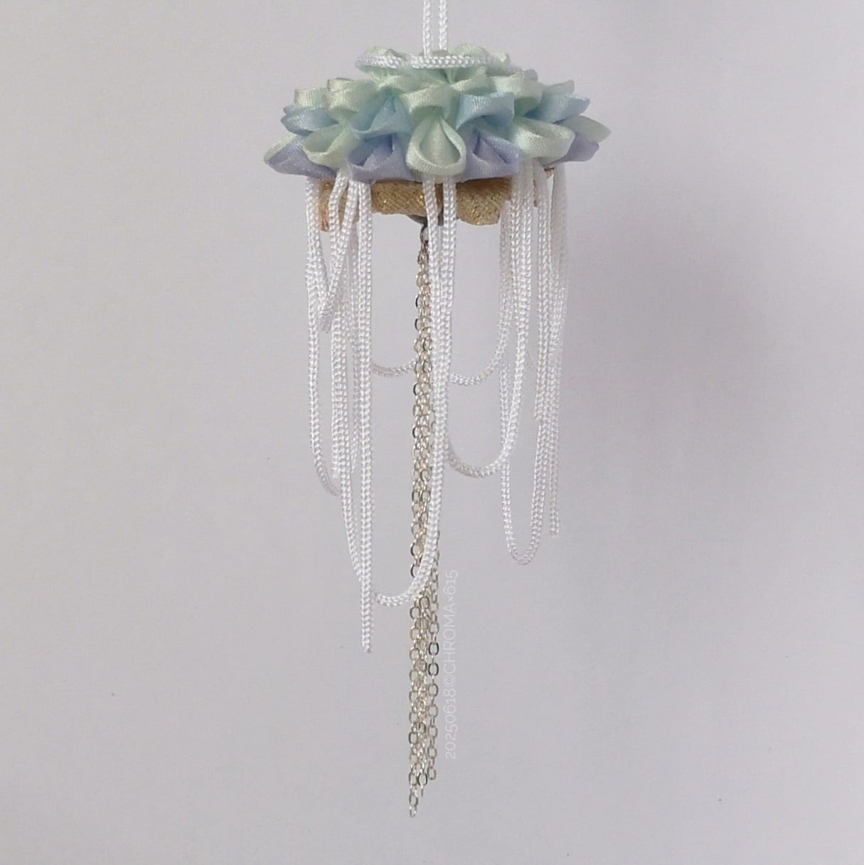 本体部分には薄絹を使用し、クラゲの透け感を。作品1・2にはレーヨン糸とチェーンで作った足を組み合わせており、実際のクラゲのように絡まり合う様子も再現しています(※軽く絡む程度で簡単にほどけます)。