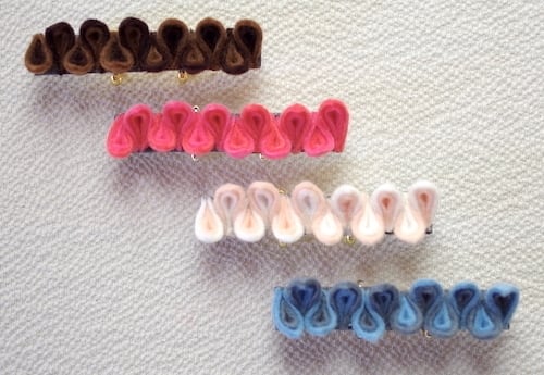フエルトの「厚い」「切り口が解けない」という特性を活かし、通常は正方形から作成するつまみ細工を半分にカット。さらに三回折りたたむところを一回に減らすことで二重つまみに。色が二重に入ることで、フエルトの単調な布感、アップリケ感が残らないように仕上げました。