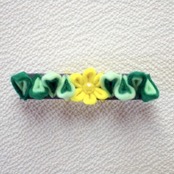 緑の葉の中心に小花を配した帯留は、花の中央には陶器のカボション。