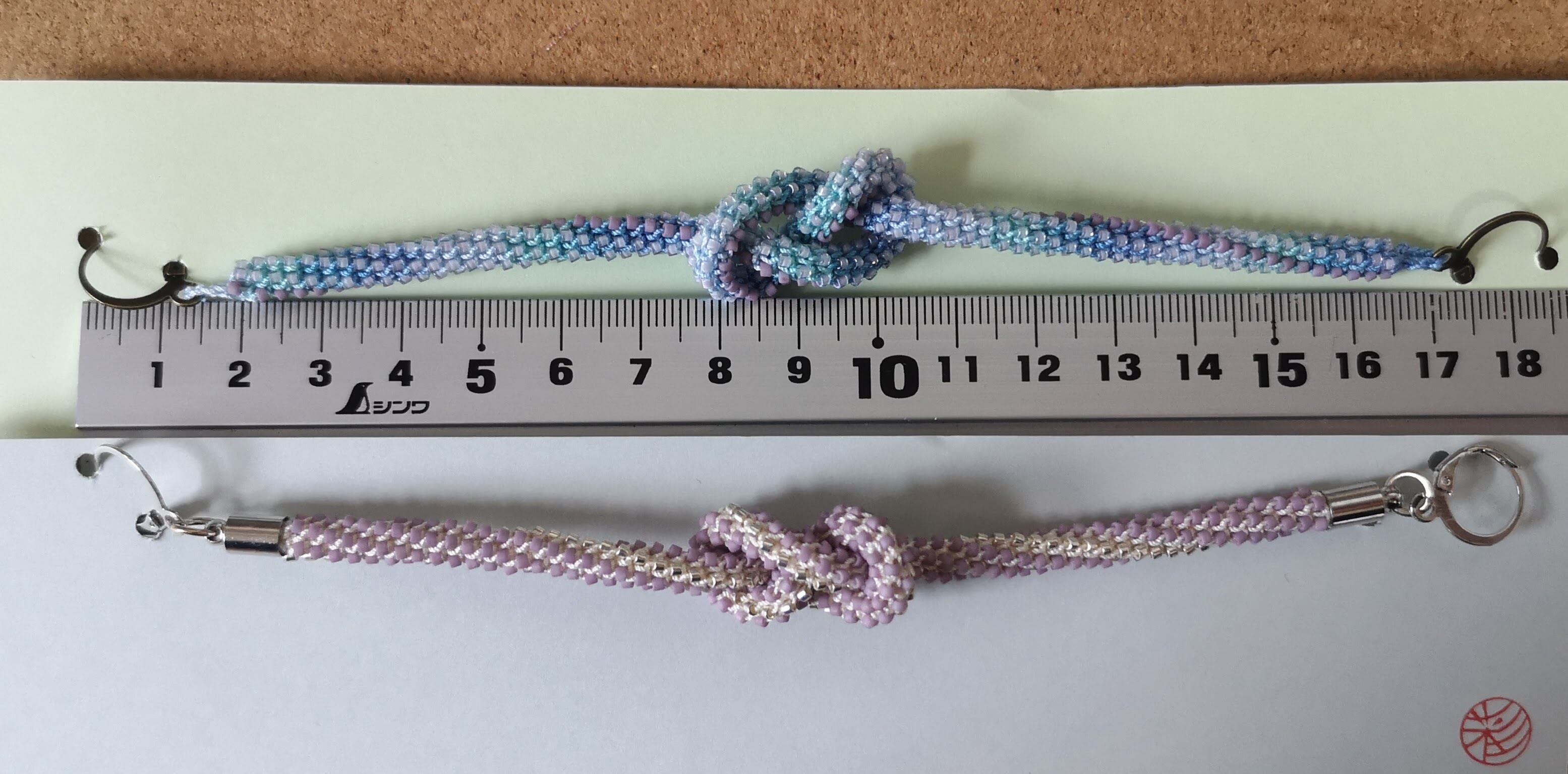 藤色、水色ともに、4粒に1粒色の違うビーズを配することで、