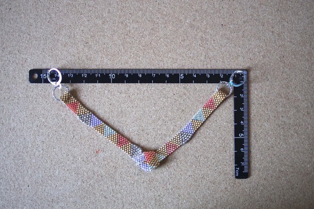 マットな金とラベンダー、金メタリックなピンク、艶のある銀、それから粒に丸みがあり少し大きい銀、この5種類のビーズで三角形を織り上げたキュートな羽織紐です。