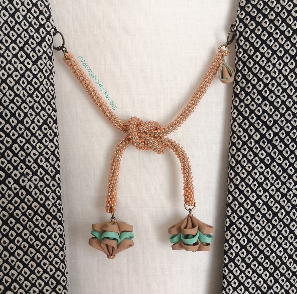 チョコミントをイメージしたビーズ編み羽織紐です。