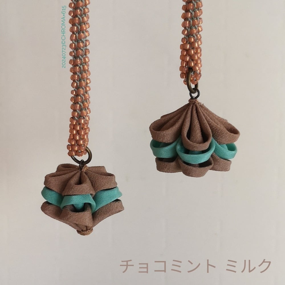 布:絹(ダークチョコのみ綿)、ガラスビーズ、コットンレース糸