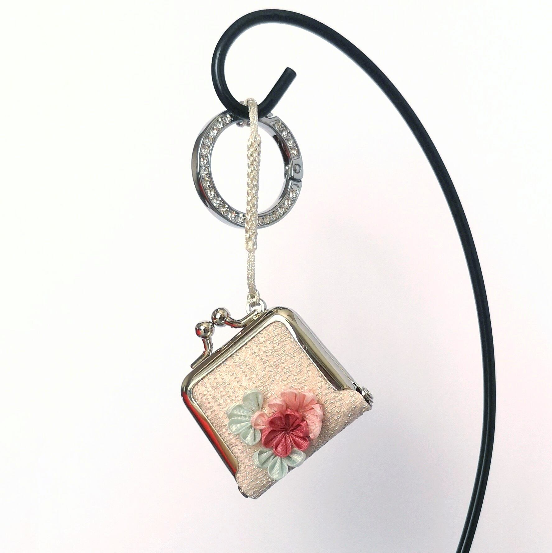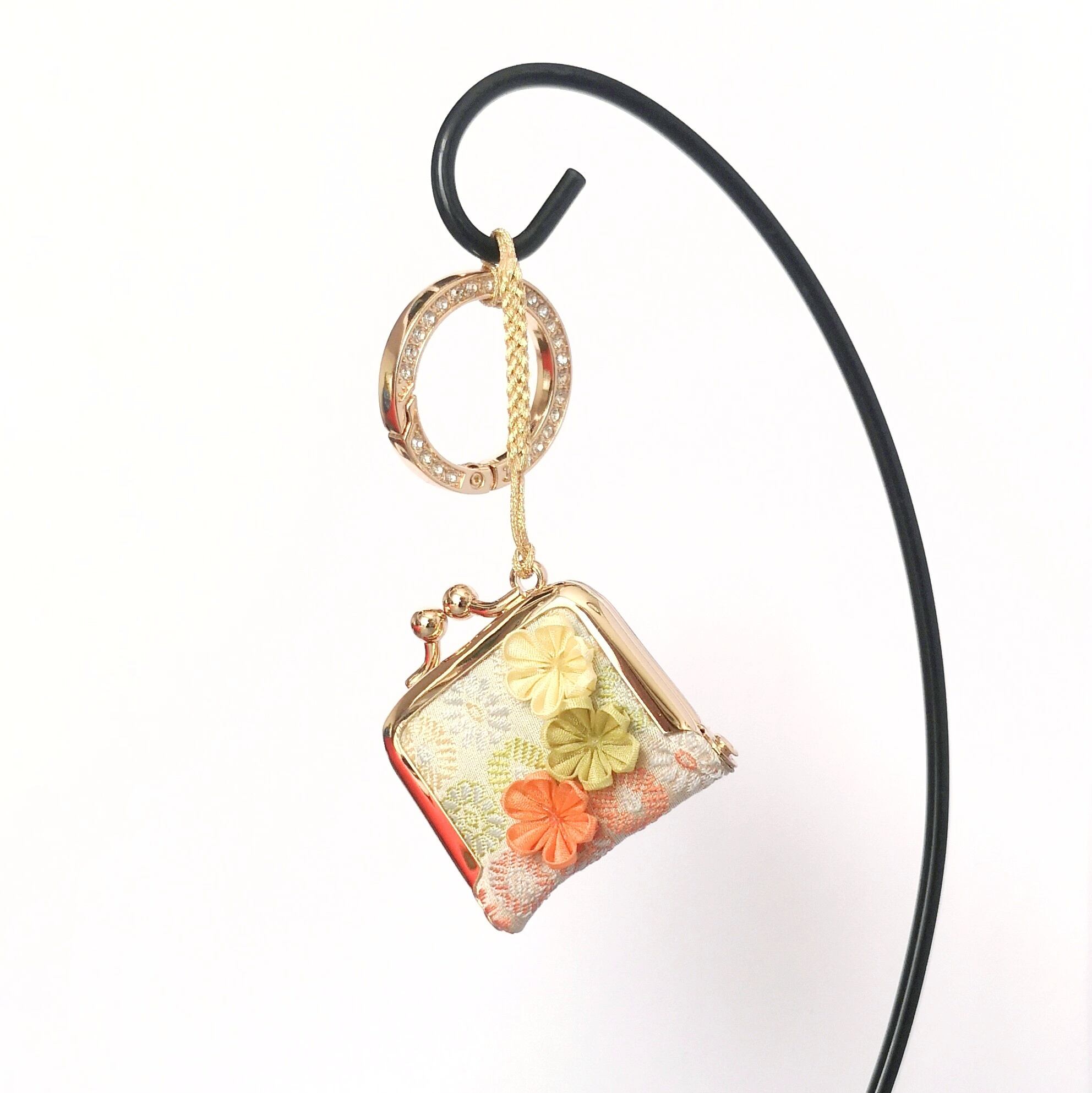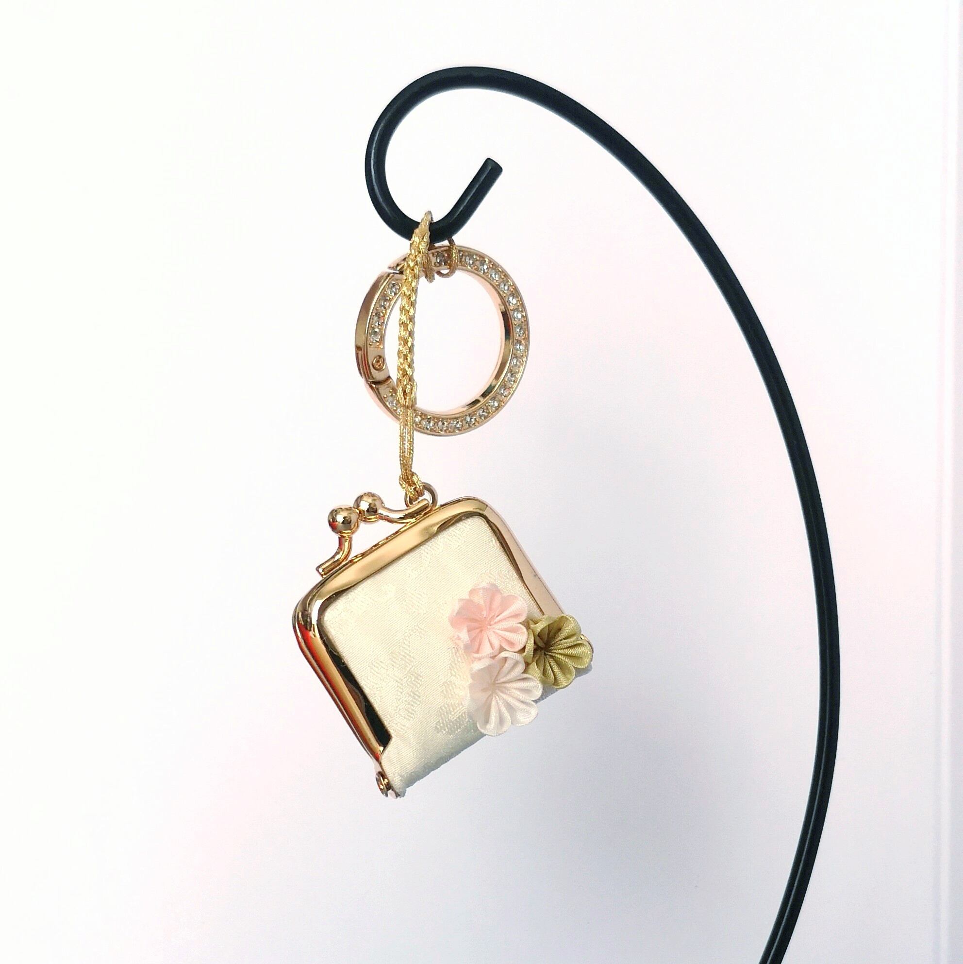 10月末に開催された神楽坂の展示会で、お客様よりつまみ細工の巾着袋の話を聞いたこと。私と同じく出展していた人がミニがま口の根付をしていたこと。2024年の2月に以前通っていたがま口教室の先生に私ががま口を製作して販売しても良いものか確認したこと。細長い雫型の根付プレートが嫌で、何かいいものはないかと考え続けていたこと。色々な経験が合わさって、2024年11月に誕生しました!