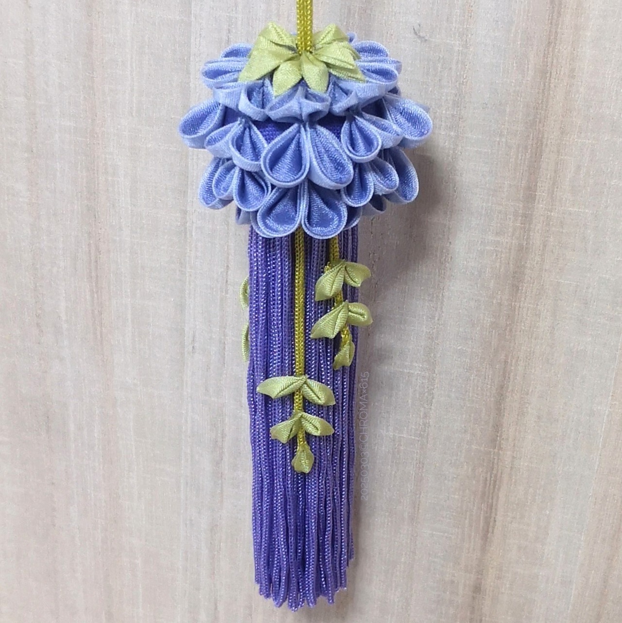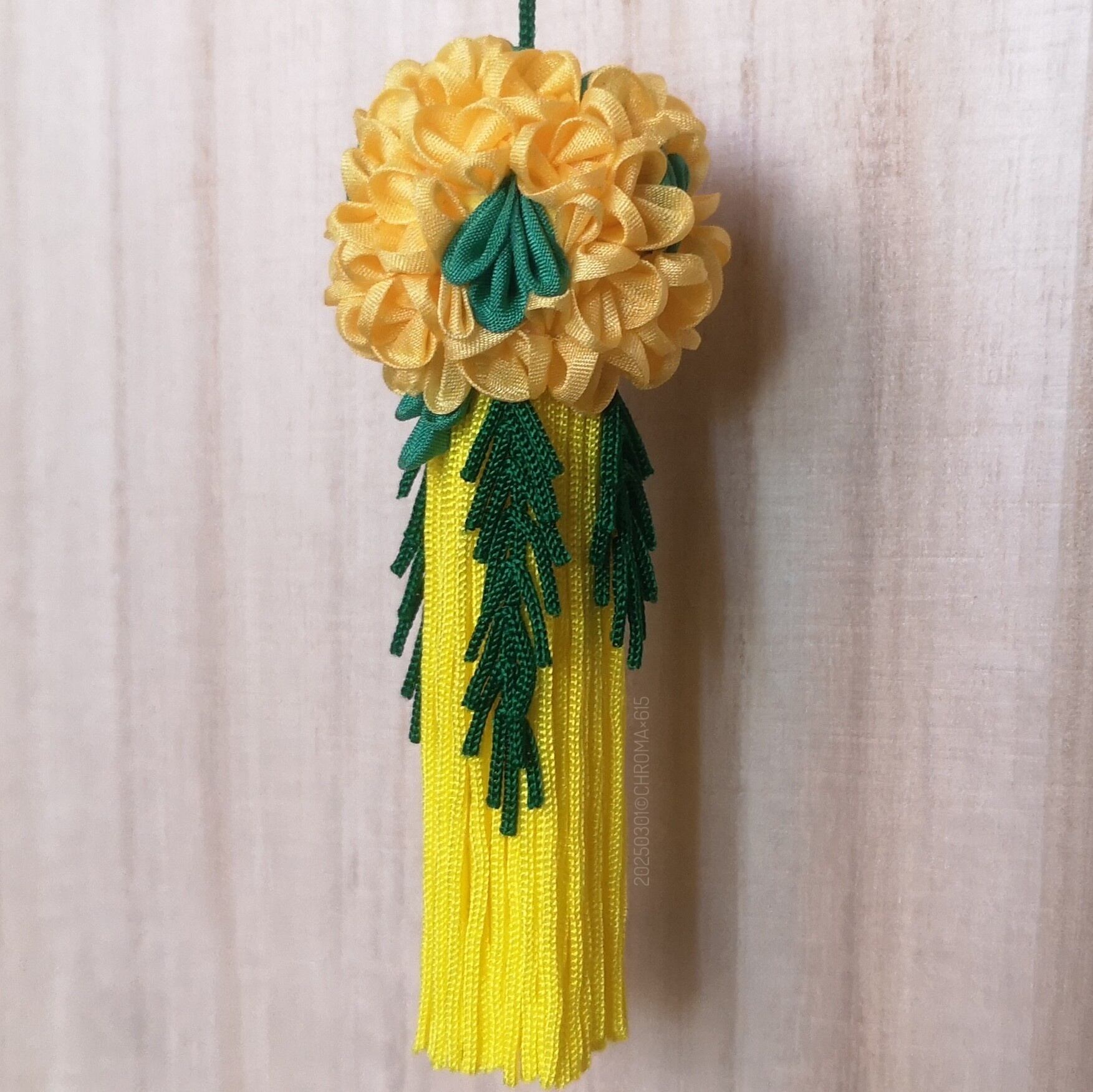 長く日本人に愛されてきた優しいピンク色と若葉の緑が魅力の「くすだま根付」です。花弁が5枚の花が約20個、花びらの総数120個ほどの春爛漫な花のくす玉飾りです。