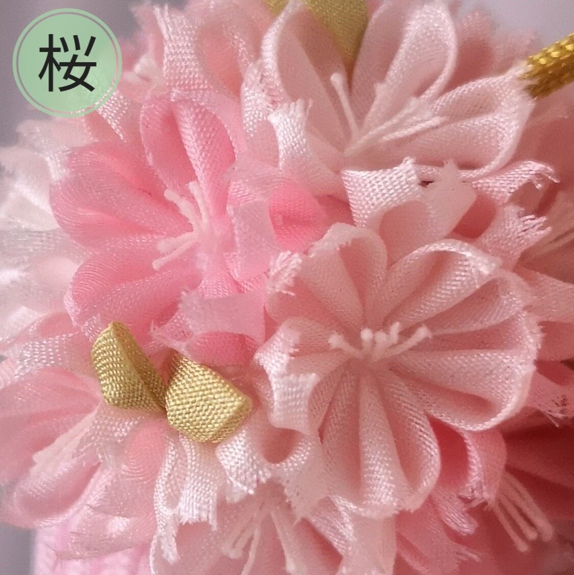 桜と桃、どちらも濃淡の違う5色のピンク色を使用。桜は先端を割って桜らしい花弁に。桃は2つセットで花が咲くので、必ず同じ色の花が2つ並んでいます。